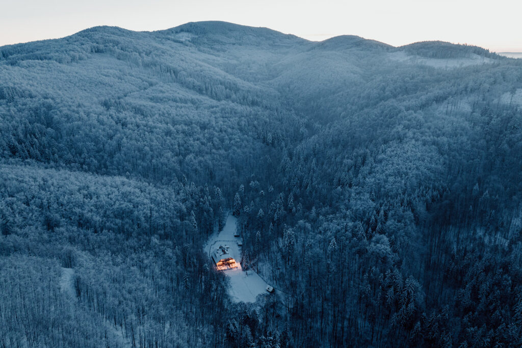 Dom stoi w dolinie, w naturalnym obniżeniu terenu. Wzgórza i drzewa otaczają go z każdej strony, dlatego przestrzeń jest tu bardziej zamknięta, spokojna, osłonięta. Szlak zaczyna się tuż za ogrodzeniem. Nie trzeba nigdzie dojeżdżać ani planować — wystarczy wyjść i wejść w las, który od razu przejmuje rytm dnia.